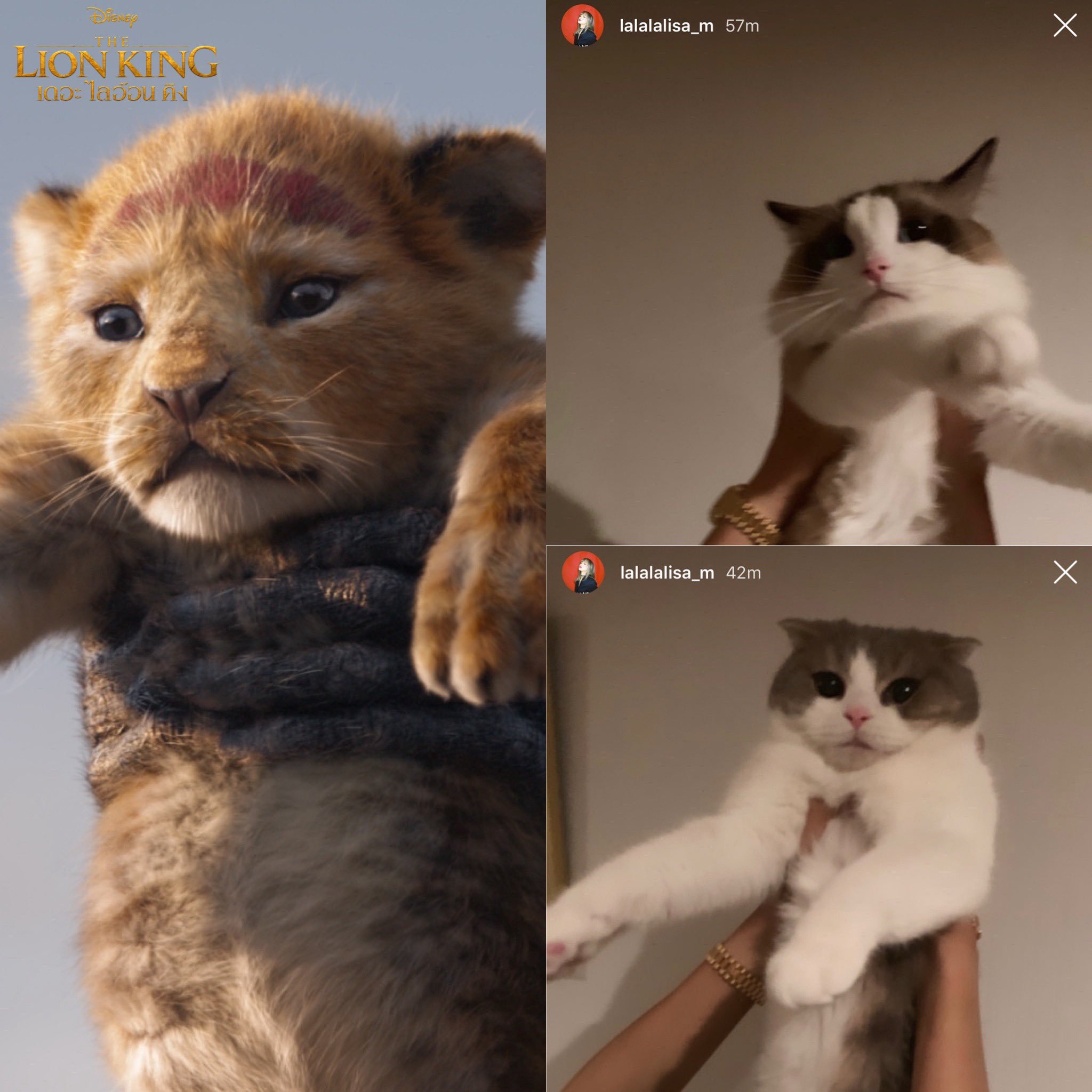 มีเรื่องราวน่ารัก ๆ มาให้แฟน ๆ ได้อมยิ้มกันอีกแล้ว สำหรับนักร้องสาวคนดัง ลิซ่า BLACKPINK ที่ล่าสุด (24 กรกฎาคม 2562) ได้โพสต์ IG Story เป็นภาพที่อุ้มน้องแมว ลีโอ และ ลูก้า ชูขึ้น คล้ายฉากในตำนานจากหนัง The Lion King พร้อมข้อความว่า "after watching The Lion King"