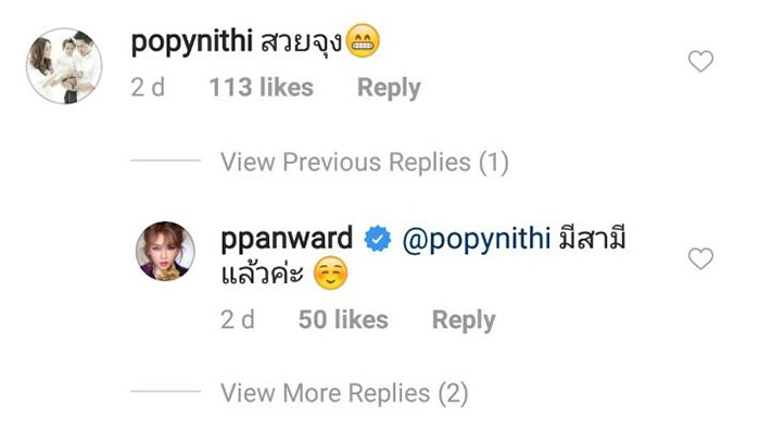 ทางด้านสามี ป็อป นิธิ ก็ได้เข้ามาคอมเมนต์จีบว่า "สวยจุง" ซึ่งฝ่ายภรรยาก็เข้ามาตอบกลับ ดักคอแบบฮา ๆ ว่า "มีสามีแล้วค่ะ" ขอโทษทีนะคะ จีบไม่ได้จ้า