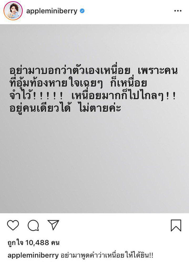 ล่าสุด (27 กรกฎาคม 2562) สาวแอปเปิ้ล โพสต์ระเบิดลงอินสตาแกรม หลังได้ยินคนบ่นว่าเหนื่อย ระบุว่า "อย่ามาบอกว่าตัวเองเหนื่อย เพราะคนที่อุ้มท้องหายใจเฉย ๆ ก็เหนื่อย จำไว้ !!! เหนื่อยมากก็ไปไกล ๆ อยู่คนเดียวได้ ไม่ตายค่ะ" พร้อมแคปชั่น อย่ามาพูดคำว่าเหนื่อยให้ได้ยิน !!
