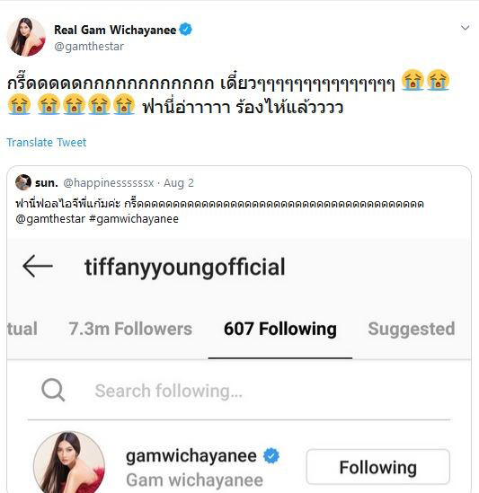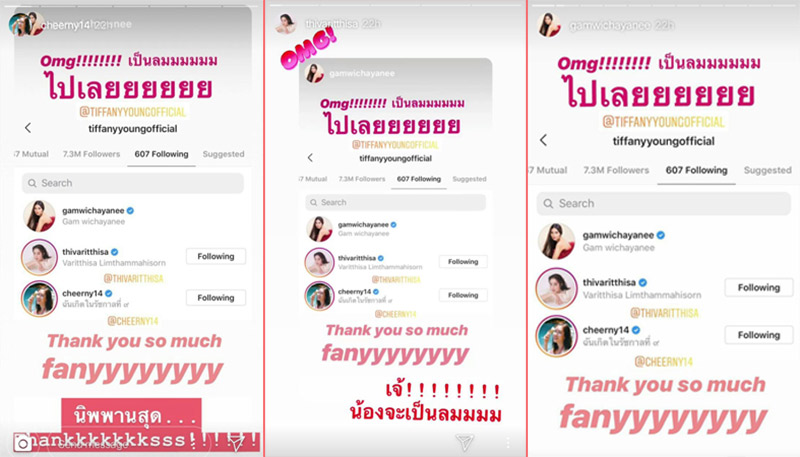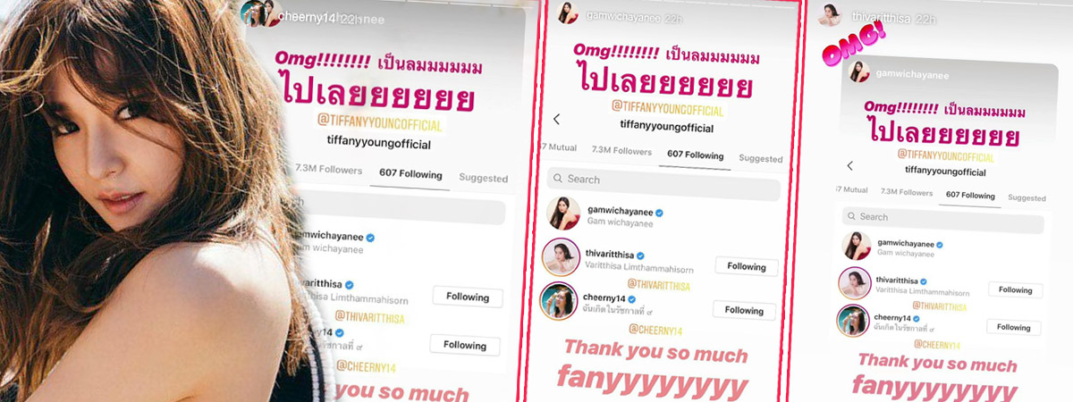 นับว่าชีวิตการเป็นแฟนคลับศิลปินเกาหลีคอมพลีตถึงขีดสุดจริง ๆ สำหรับ 3 สาว แก้ม วิชญาณี, เชียร์ ฑิฆัมพร และ ฐิสา วริฏฐิสา ที่ล่าสุด (2 สิงหาคม 2562) ทิฟฟานี่ ยัง (Tiffany Young) นักร้องสาวสุดสวย อดีตสมาชิกวง Girls' Generation ได้กดติดตามอินสตาแกรมส่วนตัวของพวกเธอ
