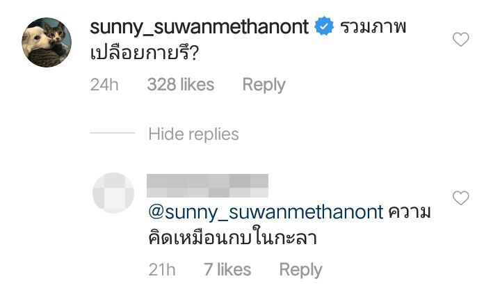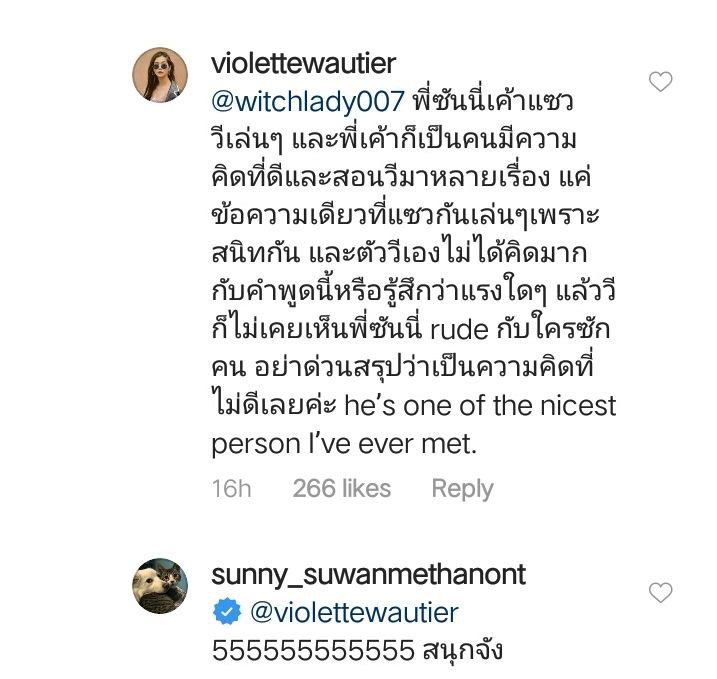 ทั้งนี้ ตนก็ไม่เคยเห็นพี่ซันนี่หยาบคายกับใครสักคน อย่าเพิ่งด่วนสรุปว่าเป็นความคิดที่ไม่ดีเลย เพราะพี่ซันนี่เป็นคนที่ดีที่สุดคนหนึ่งที่ตนเคยรู้จักมา ซึ่งหนุ่มซันนี่ก็เข้ามาคอมเมนต์ขำ ๆ ตอบข้อความของวีว่า "555555555555 สนุกจัง"