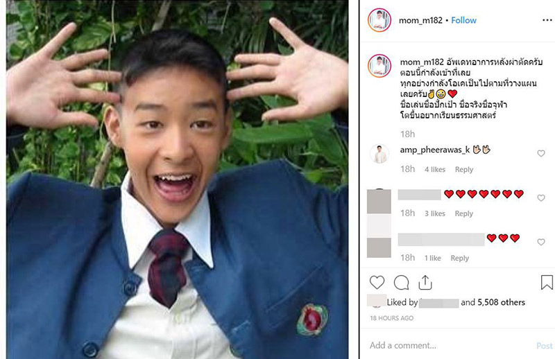 ก่อนที่ล่าสุด (7 สิงหาคม 2562) หม่อมเอ็ม จะเผยภาพในวัยเด็กของตัวเอง พร้อมอัปเดตอาการหลังผ่าตัดว่า "อัปเดตอาการหลังผ่าตัดครับ ตอนนี้กำลังเข้าที่เลย ทุกอย่างกำลังโอเคเป็นไปตามที่วางแผนเลยครับ"