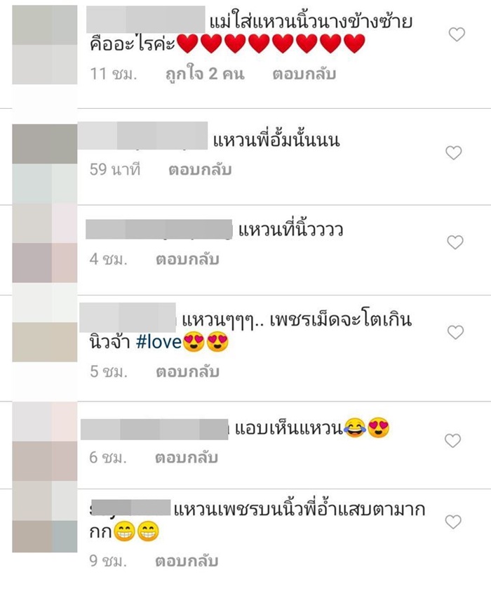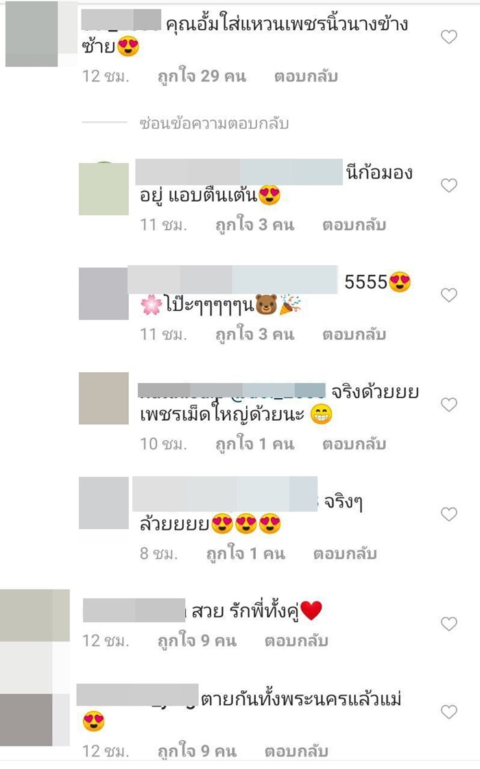 แต่งานนี้ก็มีหลายคนที่หลุดโฟกัส เพราะสังเกตเห็นแหวนเพชรเม็ดงามที่นิ้วนางข้างซ้ายของสาวอั้ม เป็นเพชรเม็ดใหญ่ ดูโดดเด่นสะดุดตา จนมีคนเข้ามาคอมเมนต์ทัก สงสัยว่าแหวนเพชรวงนี้ มีที่มาอย่างไรกันแน่ บ้างก็ทักว่าแหวนเพชรเม็ดใหญ่ แสบตามาก