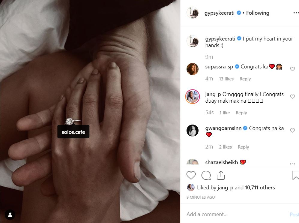 ทางด้านสาว ยิปซี คีรติ ก็ได้โพสต์ภาพมือของตัวเองที่สวมแหวน กุมมือของนิโคลัส พร้อมข้อความสั้น ๆ ว่า "I put my heart in your hands :)"
