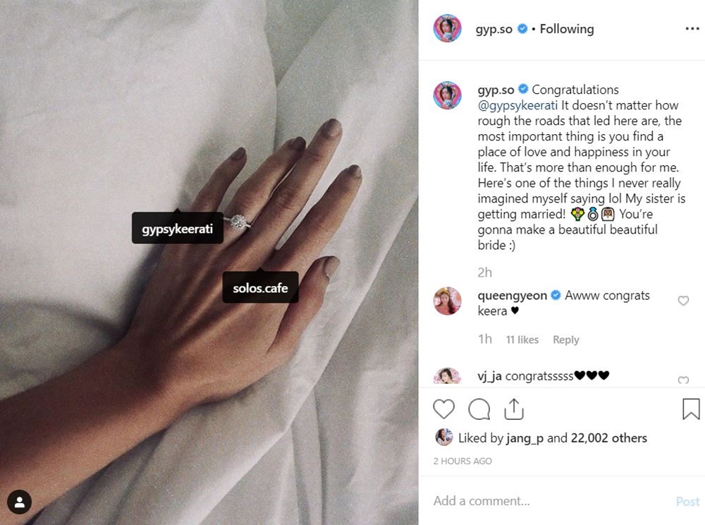 โดยงานนี้ ยิปโซ อริย์กันตา น้องสาวของ ยิปซี เป็นผู้บอกข่าวดีนี้ผ่านอินสตาแกรม โดยเผยภาพมือของยิปซี มีแหวนวงงามสวมที่นิ้วนางข้างซ้าย แท็กหายิปซีและนิโคลัส พร้อมข้อความว่า "Congratulations @gypsykeerati It doesn’t matter how rough the roads that led here are, the most important thing is you find a place of love and happiness in your life. That’s more than enough for me. Here’s one of the things I never really imagined myself saying lol My sister is getting married ! You’re gonna make a beautiful beautiful bride :)" สำหรับข้อความดังกล่าว แปลคร่าว ๆ ได้ว่า "ยินดีด้วยนะ @gypsykeerati มันไม่สำคัญว่าถนนที่นำทางมาที่นี่จะขรุขระขนาดไหน สิ่งสำคัญที่สุดคือเธอได้เจอสถานที่แห่งความรักและความสุขในชีวิต มันเกินพอแล้วสำหรับฉัน นี่เป็นสิ่งนึงที่ฉันไม่เคยคิดเลยว่าจะได้พูดออกมา (ฮา) พี่สาวของฉันกำลังจะแต่งงาน ! เธอจะต้องเป็นเจ้าสาวที่สวยมาก ๆ :)"