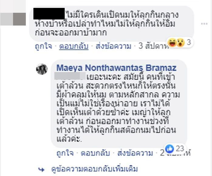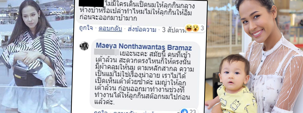 ทั้งนี้ เมญ่า ได้ตอบกลับคอมเมนต์ดังกล่าวไปว่า "เยอะนะคะ สมัยนี้ คนที่เข้าเต้าล้วน สะดวกตรงไหนก็ให้ตรงนั้น มีผ้าคลุมให้นม ตามหลักสากล ความเป็นแม่ไม่ใช่เรื่องน่าอาย เราไม่ได้เปิดเห็นเต้าด้วยซ้ำค่ะ เมญ่าให้ลูกเต้าล้วน ก่อนออกมาทำงานช่วงที่ทำงานได้ให้ลูกกินสต็อกนมไปก่อนแล้วค่ะ"