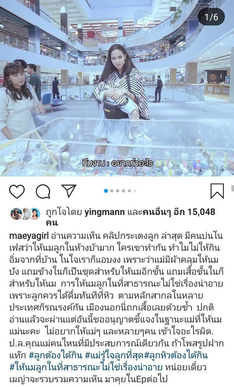 นอกจากนี้ เมญ่า ยังได้โพสต์ชี้แจงผ่านทางอินสตาแกรมด้วยว่า "อ่านความเห็น คลิปกระเตงลูก ล่าสุด มีคนบ่นในเฟซว่าให้นมลูกในห้างบ้ามาก ใครเขาทำกัน ทำไมไม่ให้กินอิ่มจากที่บ้าน ในใจเราก็แอบงง เพราะว่าแม่มีผ้าคลุมให้นมบัง แถมข้างในก็เป็นชุดสำหรับให้นมอีกชั้น แถมเสื้อชั้นในก็สำหรับให้นม การให้นมลูกในที่สาธารณะไม่ใช่เรื่องน่าอาย เพราะลูกควรได้ดื่มทันทีที่หิว ตามหลักสากลในหลายประเทศก็รณรงค์กัน เมืองนอกนี่ถกเสื้อเลยด้วยซ้ำ ปกติอ่านแล้วจะผ่านแต่อันนี้ขออนุญาตชี้แจงในฐานะแม่ที่ให้นมแม่นะคะ ไม่อยากให้แม่ ๆ และหลาย ๆ คน เข้าใจอะไรผิด ป.ล. คุณแม่คนไหนที่มีประสบการณ์เดียวกัน ถ้าโพสต์รูปฝากแท็ก #ลูกต้องได้กิน #แม่รู้ใจลูกที่สุด #ลูกหิวต้องได้กิน #ให้นมลูกในที่สาธารณะไม่ใช่เรื่องน่าอาย หน่อย เดี๋ยวเมญ่าจะรวบรวมความเห็นมาคุยใน Ep. ต่อไป"