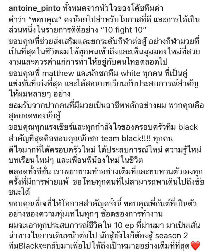 ล่าสุด (13 สิงหาคม 2562) อองตวน ได้โพสต์อินสตาแกรมระบายความในใจยาวเหยียด ทั้งขอบคุณรายการ ขอบคุณประสบการณ์ดี ๆ ขอบคุณ แมทธิว โค้ชและนักชกจากทีม White ขอบคุณทุกแรงเชียร์และทุกกำลังใจของครอบครัวทีม Black สำคัญที่สุดคือ ขอบคุณนักชก Team Black ทุกคน ดีใจมากที่ได้ครอบครัวใหม่ ได้ประสบการณ์ใหม่ จะเอาทุกประสบการณ์ 10 EP. ที่ผ่านมา มาเป็นเส้นทางในการเดินหน้าต่อไป นักสู้ยังไงก็ต้องสู้ Season 2 ทีม Black จะกลับมาเพื่อไปให้ถึงเป้าหมายอย่างเต็มที่ที่สุด
