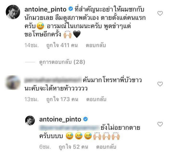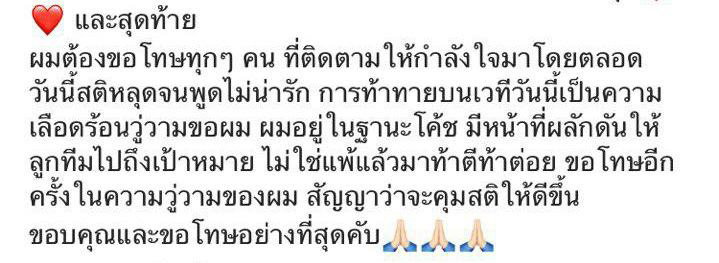 สุดท้าย อองตวน ได้ระบุว่า "ผมต้องขอโทษทุก ๆ คน ที่ติดตามให้กำลังใจมาโดยตลอด วันนี้สติหลุดจนพูดไม่น่ารัก การท้าทายบนเวทีวันนี้เป็นความเลือดร้อนวู่วามของผม ผมอยู่ในฐานะโค้ช มีหน้าที่ผลักดันให้ลูกทีมไปถึงเป้าหมาย ไม่ใช่แพ้แล้วมาท้าตีท้าต่อย ขอโทษอีกครั้งในความวู่วามของผม สัญญาว่าจะคุมสติให้ดีขึ้น ขอบคุณและขอโทษอย่างที่สุดครับ"