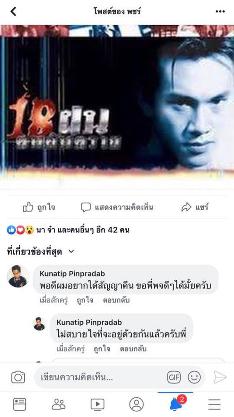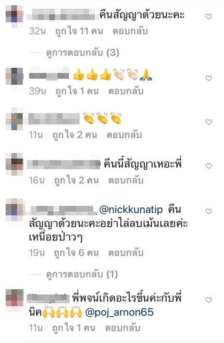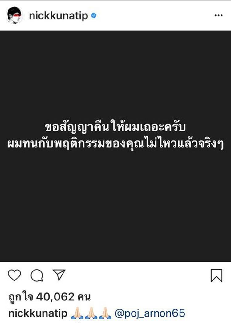 นอกจากนี้หนุ่มนิก ยังแคปข้อความที่โพสต์ในคอมเมนต์เฟซบุ๊กผู้กำกับคนดังมาลงด้วย หลังจากถูกลบข้อความทิ้ง และถูกบล็อกการติดต่อทุกช่องทางว่า "พอดีผมอยากได้สัญญาคืน ขอพี่พชร์ดี ๆ ได้มั้ยครับ ไม่สบายใจที่จะอยู่ด้วยกันแล้วครับพี่"