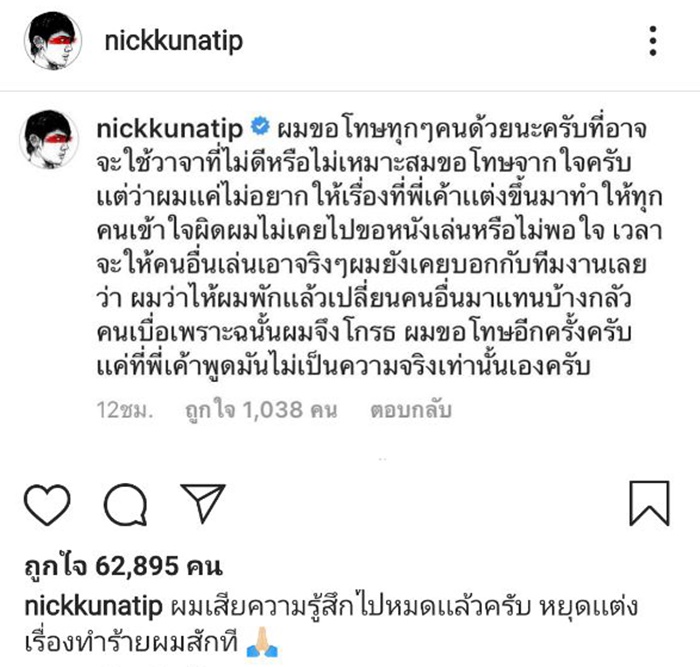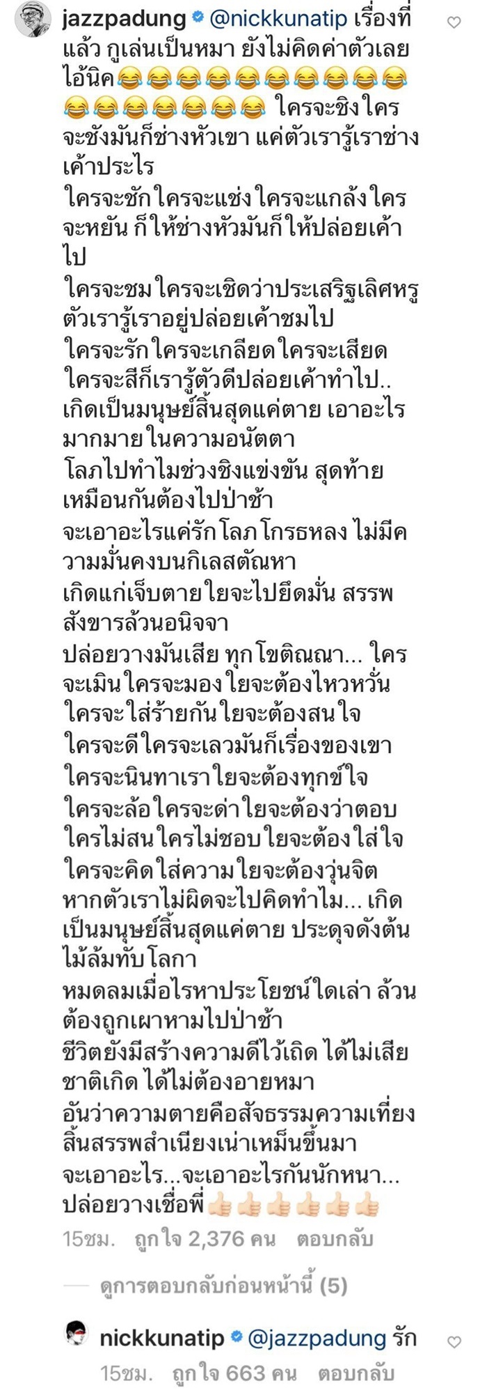 ซึ่งต่อมา แจ๊ส ชวนชื่น ได้เข้ามาคอมเมนต์ว่า @nickkunatip เรื่องที่แล้ว กูเล่นเป็นหมา ยังไม่คิดค่าตัวเลย ไอ้นิค ก่อนจะโพสต์เนื้อเพลง "ปล่อย" ใครจะชิงใครจะชังมันก็ช่างหัวเขา แค่ตัวเรารู้เราช่างเค้าประไร.. จะเอาอะไร...จะเอาอะไรกันนักหนา... ปล่อยวางเชื่อพี่