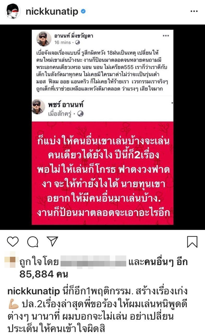 กลายเป็นประเด็นดราม่าที่ตอนนี้ก็ยังคุกรุ่น เมื่อจู่ ๆ นักแสดงวัยรุ่น นิก คุณาธิป โพสต์วอนขอให้ผู้กำกับคนดัง พชร์ อานนท์ คืนสัญญา เหตุเพราะทนกับพฤติกรรมไม่ไหวแล้วจริง ๆ และยังบอกด้วยว่า ถูกผู้กำกับคนดังลบคอมเมนต์และบล็อกการติดต่อทุกช่องทาง