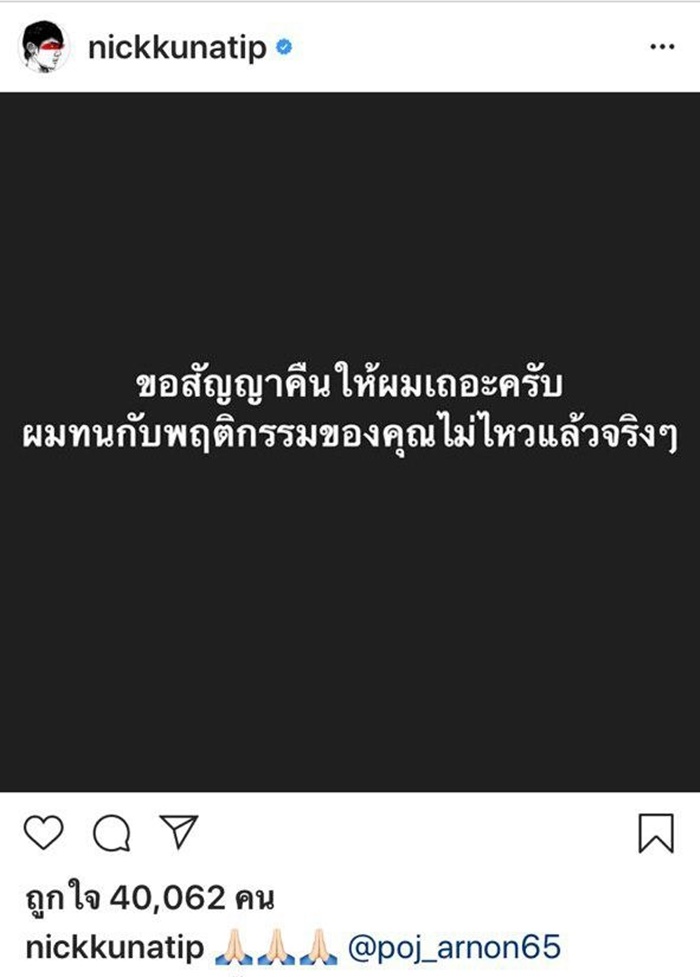 อ่านข่าว : กลิ่นดราม่า นิก คุณาธิป แท็ก พชร์ อานนท์ ขอสัญญาผมคืน สุดทนพฤติกรรม