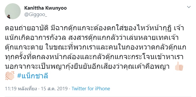 "ตอนถ่ายอาบัติ มีฉากตุ๊กแกจะต้องตกใส่ของไหว้หน้ากุฏิ เจ้าแน็กเกิดอาการกังวล สงสารตุ๊กแกกลัวว่าเล่นหลายเทกเจ้าตุ๊กแกจะตาย ในขณะที่พวกเราและคนในกองหวาดกลัวตุ๊กแกทุกครั้งที่ตกลงหน้ากล้องและกลัวตุ๊กแกจะกระโจนเข้าหาเรา นอกจากจะเป็นพญากุ้งยืนยันอีกเสียงว่าคุณเขาคือพญา #แน็กชาลี"