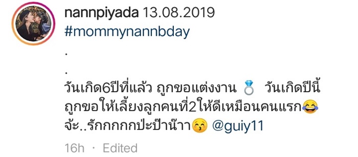 แถมยังมีการตอกย้ำความหวานด้วยภาพของขวัญวันเกิดสุดพิเศษจากคุณสามี ที่ได้มอบแหวนเพชรเม็ดโตให้ พร้อมกับเขียนข้อความชวนให้ยิ้มตามว่า "13.08.2019 #mommynannbday วันเกิด 6 ปีที่แล้ว ถูกขอแต่งงาน วันเกิดปีนี้ ถูกขอให้เลี้ยงลูกคนที่ 2 ให้ดีเหมือนคนแรก จ้ะ.. รักกกกกป่ะป๊าน๊าา @guiy11"