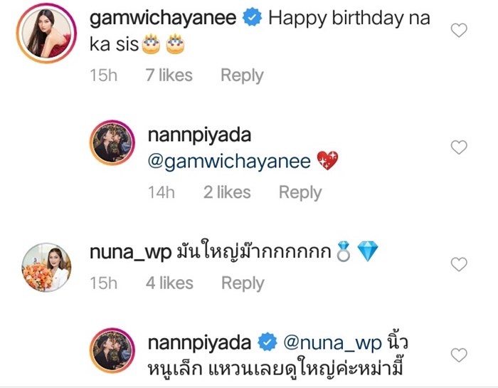 ทำเอาหลายคนเข้ามาคอมเมนต์สุขสันต์วันเกิดสาวแนน แถมแซวว่าแหวนเพชรใหญ่มากอีกด้วย ซึ่งเจ้าตัวก็บอกว่านิ้วตัวเองเล็ก แหวนก็เลยดูใหญ่ต่างหาก