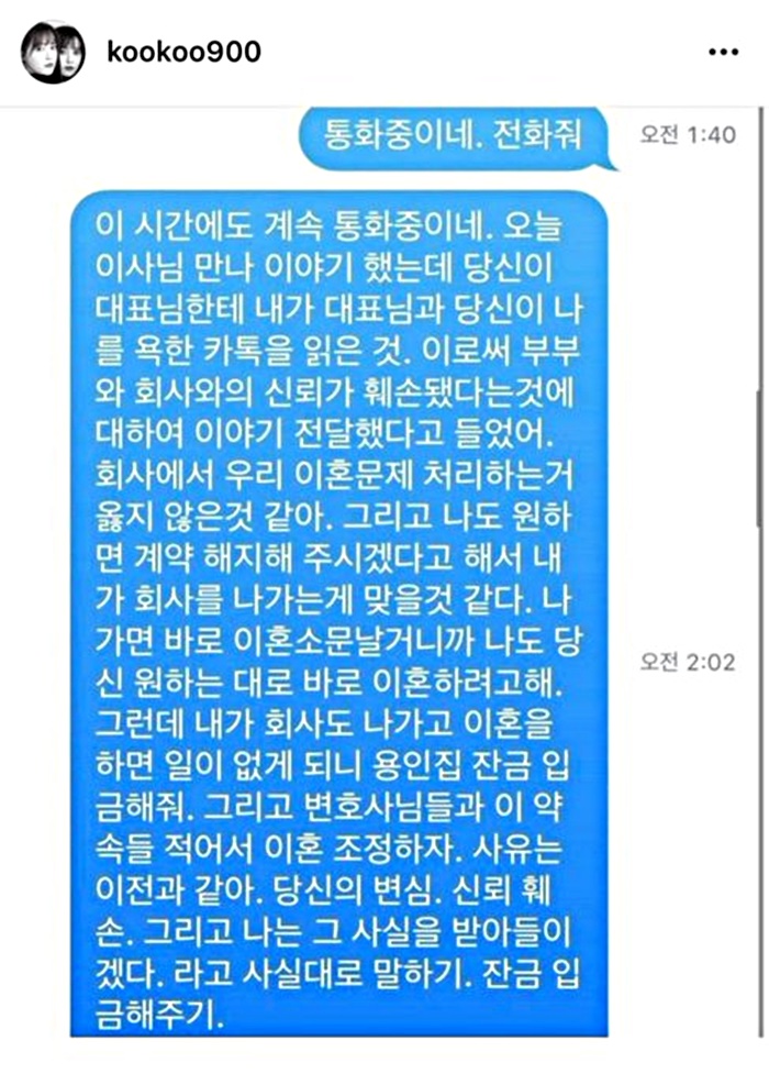 คืบหน้าวันที่ 18 สิงหาคม 2562 คูฮเยซอน ได้โพสต์แชตเพิ่มเติมขณะส่งข้อความหา อันแจฮยอน ว่า ตอนนี้ก็ยังติดสายอยู่เหรอ ฉันได้ยินมาว่าคุณบอกประธานเรื่องที่ว่าฉันอ่านแชตที่คุณและประธานด่าฉัน จนทำให้ความเชื่อถือระหว่างบริษัทและความสัมพันธ์ของเราเสื่อมเสีย มันไม่ถูกต้องที่ทางบริษัทจะต้องมาจัดการเรื่องหย่าของเรา และเขาบอกว่าจะยอมยุติสัญญาถ้าฉันต้องการ ฉันคิดว่าฉันควรจะออก แต่ถ้าฉันออกจากบริษัทไปแล้วมีข่าวหย่า ฉันคงไม่มีงานทำ ฉันอยากให้คุณโอนเงินค่าบ้านที่เหลือของบ้านที่ยงอินให้ฉันด้วย และคุยกับทนายเรื่องหย่าโดยเอาสัญญาเหล่านี้มาเขียนด้วย หัวใจคุณเปลี่ยนไป ไม่มีความไว้วางใจ ฉันจะยอมรับความจริงเหล่านี้ โปรดส่งเงินที่เหลือมาด้วย