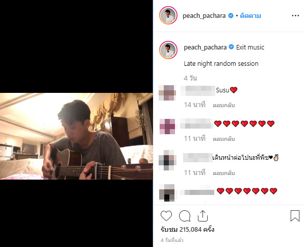 ล่าสุด เมื่อเข้าไปส่องในอินสตาแกรมของ หนุ่มพีช ก็พบว่ามีแฟนคลับเข้าไปคอมเมนต์ให้กำลังใจเจ้าตัวเป็นจำนวนมากในโพสต์ที่เจ้าตัวได้โพสต์คลิปเล่นกีต้าร์ในเพลงโมเมนต์ ๆ เศร้า พร้อมแคปชั่นว่า Exit music Late night random session โดยบางคนก็บอกว่า ไม่ว่าจะเกิดอะไรขึ้น ก็ขอให้ผ่านมันไปให้ได้ด้วยดี บางคนก็ดูคลิปแล้วก็อินบอกว่าร้องไห้ตามไปด้วย หลายคนอินหนักประกาศลั่นขอเลิกติดตามดูผลงาน แพทริเซีย เลยก็มี