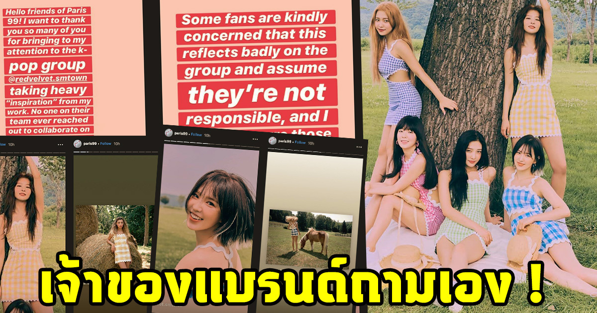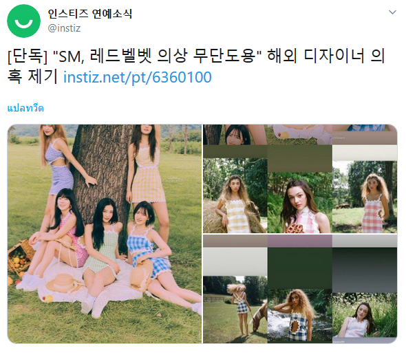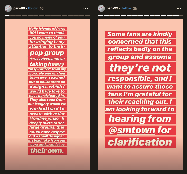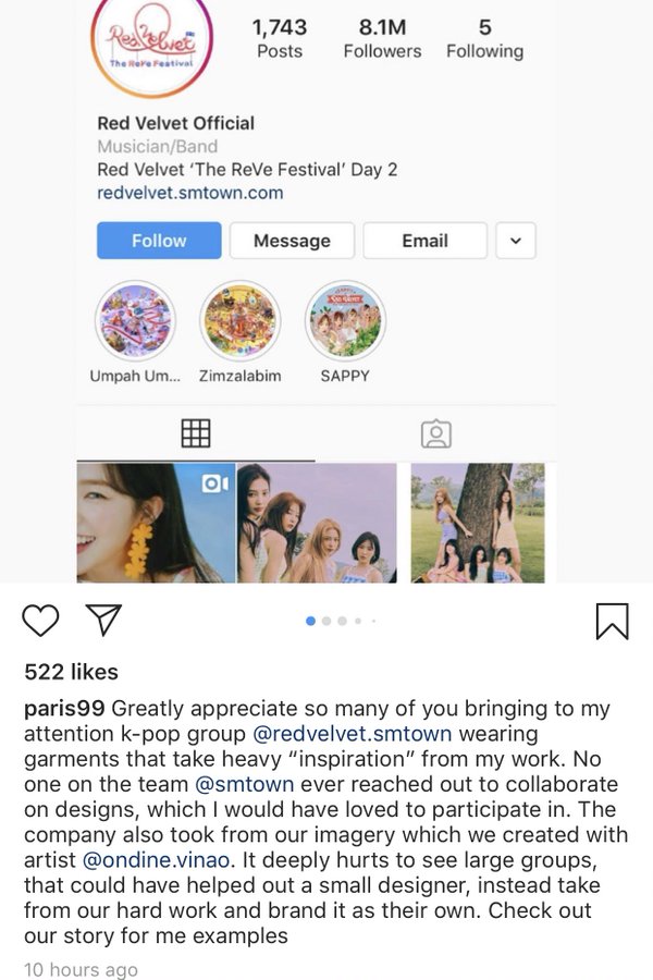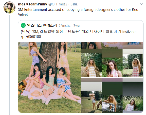 โดยทางแบรนด์กล่าวว่า ขอบคุณมากที่พวกคุณหลายคนพาฉันมาถึงวงการเคป๊อป Red Velvet ใส่เสื้อผ้าที่ใช้แรงบันดาลใจจากงานของฉัน แต่ไม่มีใครในทีม SM Entertainment ที่เคยร่วมมือออกแบบเลย ทางเรารู้สึกเจ็บปวดมาก สุดท้ายทางเราจะรอคอยคำตอบเกี่ยวกับเรื่องนี้จากทาง SM Entertainment