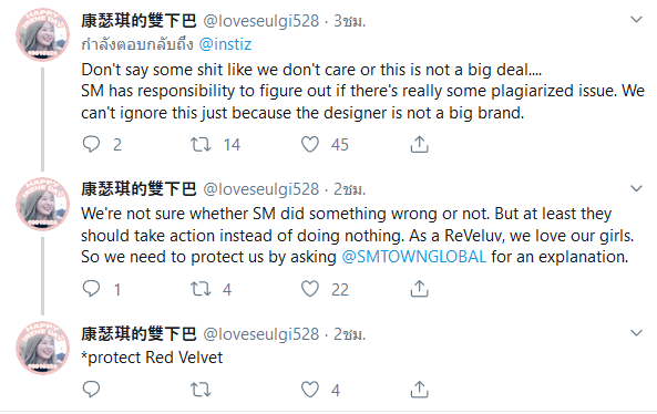 อย่างไรก็ตาม ก็มีแฟนคลับและชาวเน็ตออกมาแสดงความคิดเห็นเป็นจำนวนมาก ทางค่ายและสไตลิสต์ผู้ออกแบบคอสตูมให้กับเอ็มวีเพลงนี้นั้นควรออกมาชี้แจงในเรื่องนี้ และไม่ควรเพิกเฉย แม้แบรนด์ดังกล่าวจะไม่ใช่แบรนด์ใหญ่ก็ตาม