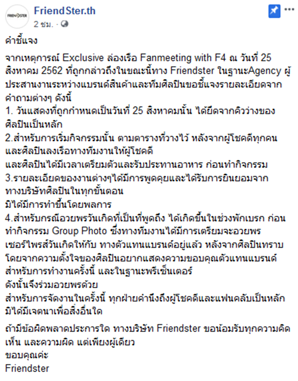 ล่าสุด (28 สิงหาคม 2562) Friendster ซึ่งเป็นเอเจนซี่ที่ประสานงานระหว่างแบรนด์สินค้าและทีมศิลปินในการจัดงานครั้งนี้ ก็ได้ออกมาชี้แจงถึงเหตุการณ์ที่เกิดขึ้นด้วย โดยเผยว่า วันที่จัดงานนั้นถูกกำหนดเป็นวันที่ 25 สิงหาคม เนื่องจากยึดจากคิวว่างของศิลปินเป็นหลัก อีกทั้งรายละเอียดงานต่าง ๆ ได้มีการพูดคุยและได้รับการยินยอมจากทางบริษัทของศิลปินในทุกขั้นตอน ไม่ได้ทำขึ้นโดยพลการ