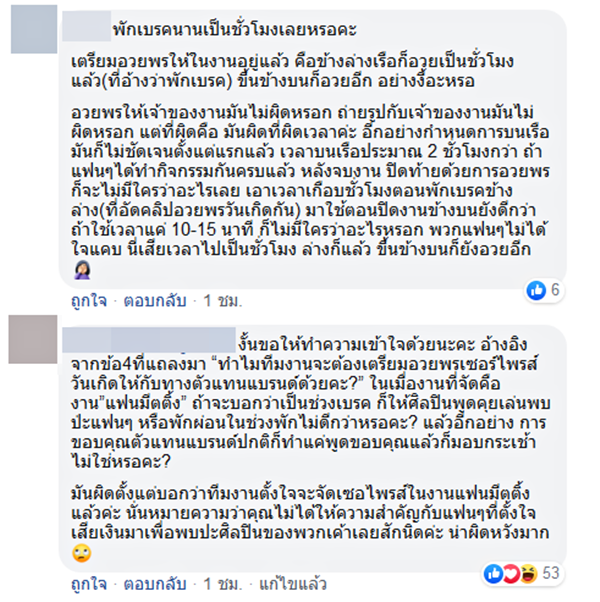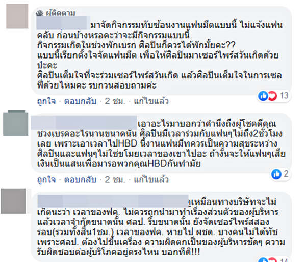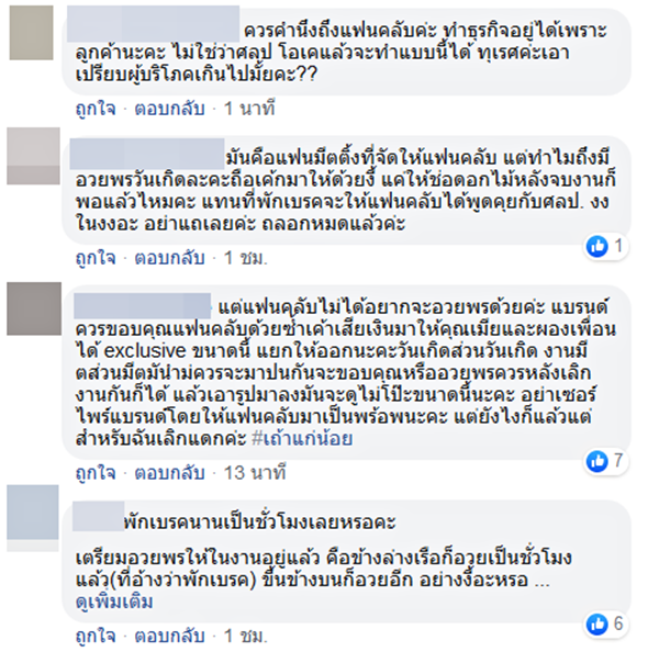 และทำไมทางทีมงานถึงไม่แจ้งให้ทาง Top Spender และแฟนคลับได้รับทราบก่อนว่าจะมีการจัดงานแบบนี้ ทำไมถึงปล่อยให้คนที่เสียเงินเป็นหมื่น ๆ แสน ๆ ไปนั่งรอโดยที่ไม่รู้อะไรเป็นชั่วโมง ซึ่งชื่องานก็บอกว่าเป็นงานแฟนมีตติ้ง หากคำนึงถึงแฟนคลับจริงก็ไม่ควรเกิดเหตุการณ์แบบนี้ขึ้นด้วยซ้ำ ดูเป็นการเอาเปรียบผู้บริโภคที่เสียเงินเป็นแสน ๆ งานควรมีแค่แฟนคลับและศิลปิน ไม่ใช่จัดเซอร์ไพรส์เจ้าของแบรนด์สินค้า หรือเอนเตอร์เทนให้เพื่อนภรรยาเจ้าของแบรนด์