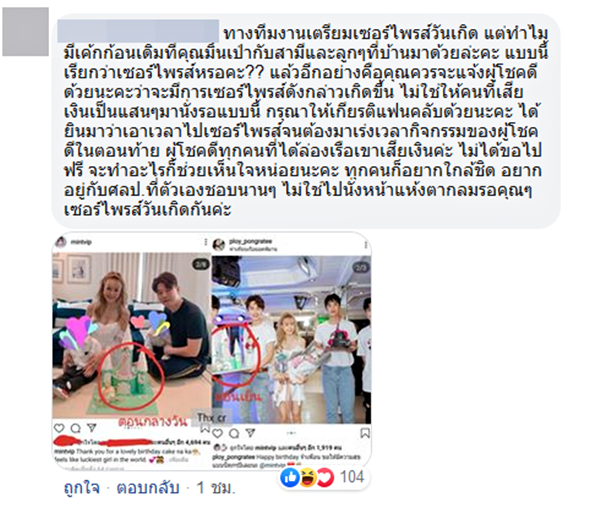 อย่างไรก็ตาม ภายหลังจากที่ทางเอเจนซี่ได้ออกมาชี้แจงก็มีแฟนคลับและชาวเน็ตเข้าไปคอมเมนต์โต้แย้งเป็นจำนวนมาก โดยมีคนตั้งข้อสังเกตว่า หากทีมงานเป็นคนเตรียมงานจริง ทำไมเค้กที่ใช้เซอร์ไพรส์ในงานช่วงเย็นซึ่งจัดบนเรือ ถึงดูเหมือนเค้กก้อนเดียวกันกับที่ มิ้นท์ ประภัสสร ใช้จัดงานที่บ้านกับสามีและลูก ๆ ตอนกลางวัน