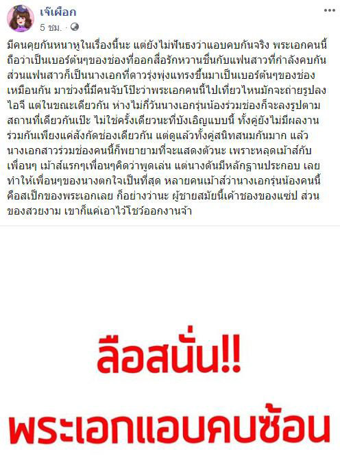 มีเผือกร้อน ๆ มาเสิร์ฟอีกแล้ว สำหรับเฟซบุ๊กเพจ เจ๊เผือก ที่ออกมาเม้าท์เรื่องพระเอกแอบคบซ้อน แม้จะยังไม่ฟันธงว่าเป็นเรื่องจริงหรือไม่ แต่ก็ทำเอาชาวเน็ตขุดกันไม่หยุด โดยระบุคำใบ้ว่า เป็นพระเอกเบอร์ต้น ๆ ของช่อง ที่ออกสื่อรักหวานชื่นกับแฟนสาว ซึ่งเป็นนางเอกดาวรุ่งเบอร์ต้น ๆ ของช่องเหมือนกัน แต่ตอนนี้กับถูกจับโป๊ะว่า พระเอกคนดังกล่าว กำลังแอบคบซ้อนกับนางเอกรุ่นน้องร่วมช่อง เนื่องจากเวลาพระเอกลงรูปเที่ยวที่ไหน ห่างกันไม่กี่วันนางเอกรุ่นน้องคนนี้ก็จะลงรูปตาม ซึ่งเป็นสถานที่เดียวกันเป๊ะ