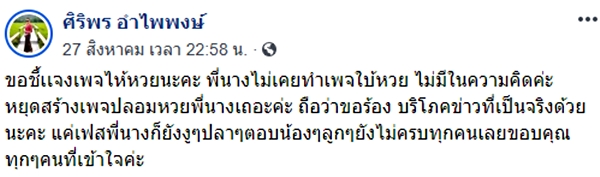 ล่าสุด (27 สิงหาคม 2562) ศิริพร อำไพพงษ์ ก็ได้ออกมาชี้แจงถึงเรื่องนี้ในเฟซบุ๊กส่วนตัวว่า "ขอชี้เเจงเพจให้หวยนะคะ พี่นางไม่เคยทำเพจใบ้หวย ไม่มีในความคิดค่ะ หยุดสร้างเพจปลอมหวยพี่นางเถอะค่ะ ถือว่าขอร้อง บริโภคข่าวที่เป็นจริงด้วยนะคะ แค่เฟซบุ๊กพี่นางก็ยังงู ๆ ปลา ๆ ตอบน้อง ๆ ลูก ๆ ยังไม่ครบทุกคนเลย ขอบคุณทุก ๆ คนที่เข้าใจค่ะ"