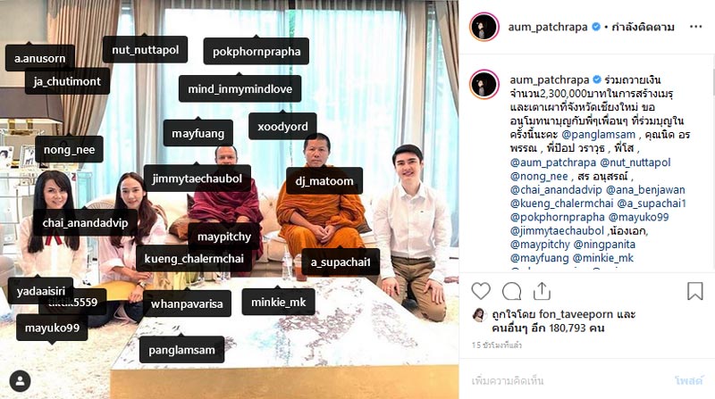 โดย สาวอั้ม ยังได้แท็กถึงเพื่อน ๆ ทั้งในและนอกวงการที่ร่วมทำบุญในครั้งนี้อย่างครบถ้วน อาทิ ไฮโซพก ประธานวงศ์ พรประภา, เมย์ พิชญ์นาฏ, กึ้ง เฉลิมชัย, เอ ศุภชัย, แหวนแหวน ปวริศา, ดีเจมะตูม ฯลฯ ซึ่งก็มีแฟน ๆ มาร่วมอนุโมทนาบุญเป็นจำนวนมาก