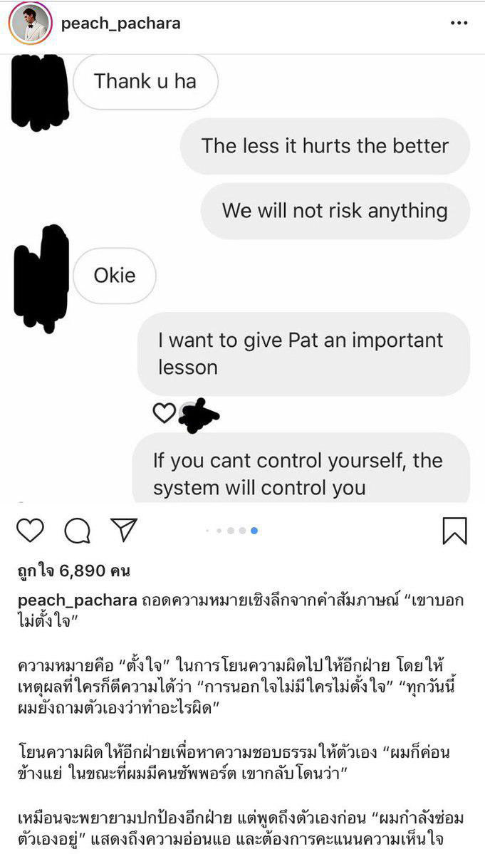 จากนั้น แคปชั่นประกอบภาพนี้ ก็มีความน่าสนใจไม่แพ้กัน กับข้อความวิเคราะห์เรื่องที่พีชให้สัมภาษณ์เมื่อคราวเลิกกับแพทริเซีย แต่เป็นการตำหนิตัวพีชเองล้วน ๆ ว่า คำพูดในการให้สัมภาษณ์ครั้งนั้นดูดี แต่พีชเอาความดีเข้าตัว และโยนความผิดให้แพทริเซีย
