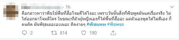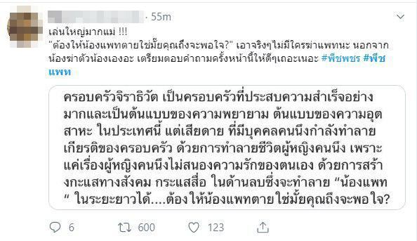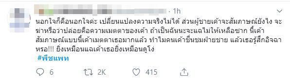 ด้านโลกออนไลน์อย่างทวิตเตอร์ ได้ดันแฮชแท็ก #พีชแพท และ #พีชพชร กลับมายืนหนึ่งอีกครั้ง และหลายคนได้คาดการณ์กันไปต่าง ๆ นานา พร้อมกับบอกว่า พีชเองไม่ได้ใช้พื้นที่สื่อโจมตีใคร และเป็นแพทริเซียเอง ที่ตอบคำถามฆ่าตัวเองทั้งนั้น