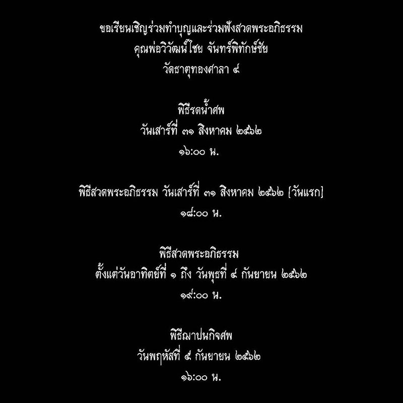 โดยในวันนี้ (31 สิงหาคม 2562) จะมีพิธีรดน้ำศพ คุณพ่อวิวัฒน์ไชย จันทร์พิทักษ์ชัย ที่วัดธาตุทอง ศาลา 4 ตั้งแต่เวลา 16.00 น. สำหรับ กำหนดการสวดพระอภิธรรม จะมีตั้งแต่วันนี้ ไปจนถึงวันที่ 4 กันยายน และจะมีพิธีฌาปนกิจ ในวันที่ 5 กันยายน 2562 เวลา 16.00 น.