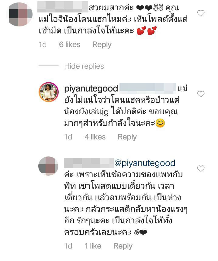 โดยคุณแม่ปิยนุช ตอบกลับว่า ตนยังไม่แน่ใจว่าโดนแฮกหรือเปล่า แต่แพทริเซียยังเล่นอินสตาแกรมได้ปกติ พร้อมขอบคุณสำหรับกำลังใจที่ให้มา