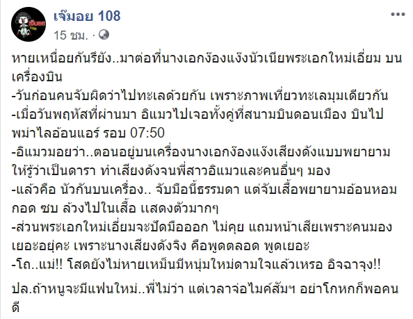 เอ้า ! ขาเผือกทั้งหลายเร่เข้ามาจ้า มีข่าวมาแรงอีกแล้ว เมื่อล่าสุด (1 กันยายน 2562) เจ๊มอย 108 ได้เมาท์ว่า นางเอกง้องแง้งนัวเนียพระเอกใหม่เอี่ยม บนเครื่องบิน วันก่อนคนจับผิดว่าไปทะเลด้วยกัน เพราะภาพเที่ยวทะเลมุมเดียวกัน เมื่อวันพฤหัสบดีที่ผ่านมา อิแมวไปเจอทั้งคู่ที่สนามบินดอนเมือง บินไปพม่าไลอ้อนแอร์ รอบ 07.50 น.
