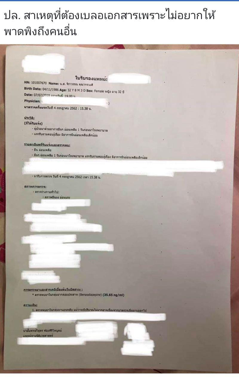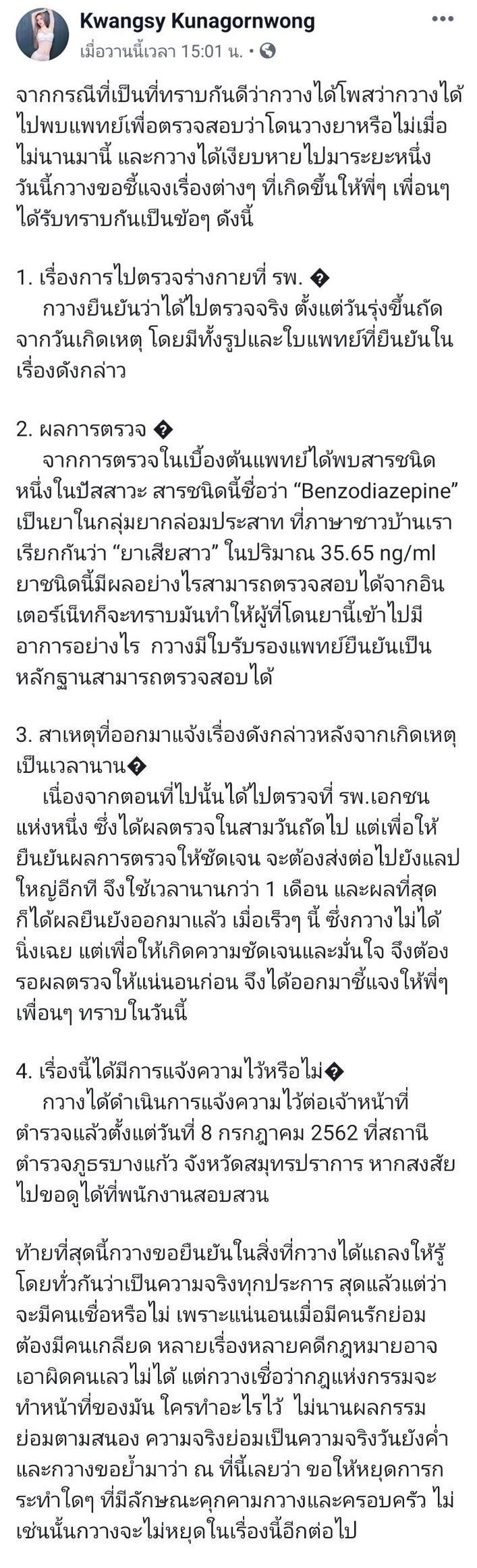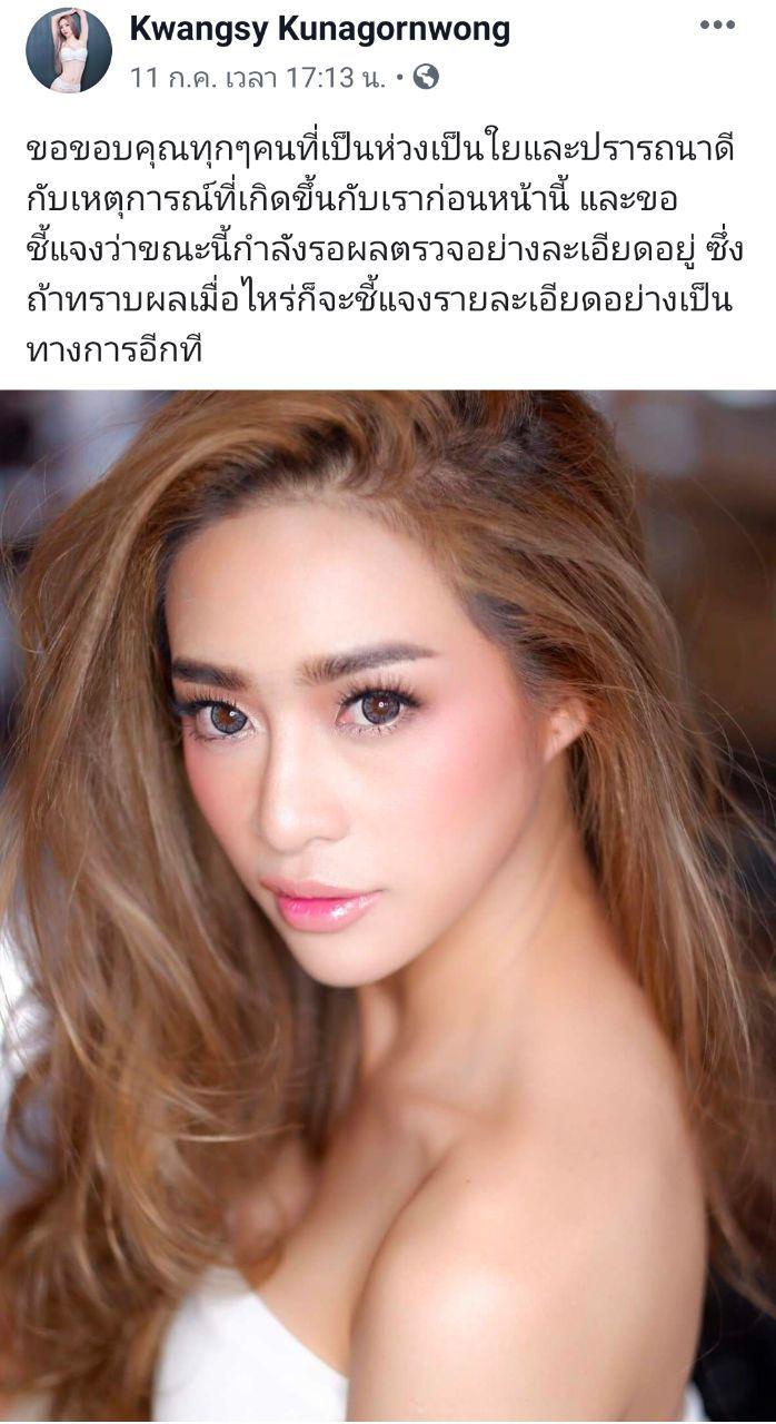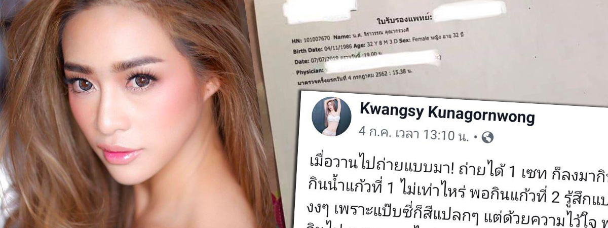 วันที่ 2 กันยายน 2562 มีรายงานว่า ผู้ใช้เฟซบุ๊ก Kwangsy Kunagornwong หรือ กวาง นางแบบเซ็กซี่ ที่มีคนติดตามในเฟซบุ๊กกว่า 7 หมื่นราย ได้โพสต์ภาพใบรับรองแพทย์ลงในเฟซบุ๊ก เผยว่า ตนเองได้ไปพบแพทย์เพื่อตรวจสอบว่าโดนวางยาหรือไม่ โดยได้ตรวจตั้งแต่วันรุ่งขึ้น ถัดจากวันที่เกิดเหตุ ผลการตรวจพบสารชนิดหนึ่ง ซึ่งชาวบ้านเรียกกันว่า "ยาเสียสาว" ในปัสสาวะ ส่วนสาเหตุที่แจ้งเรื่องหลังจากเกิดเหตุนาน เพราะต้องรอผลการตรวจอย่างชัดเจนจากแล็บใหญ่ ซึ่งใช้เวลานานกว่า 1 เดือน โดยตนได้แจ้งความไว้แล้วตั้งแต่วันที่ 8 กรกฎาคม และยืนยันว่าสิ่งที่ตนแถลงเป็นความจริงทุกประการ และที่ต้องเบลอเอกสารเพราะไม่อยากพาดพิงถึงคนอื่น