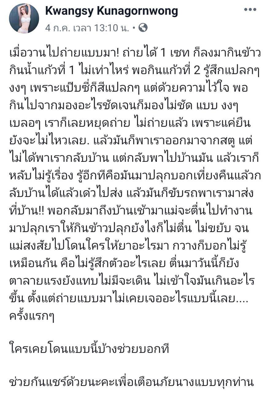 โดยย้อนกลับไปเมื่อวันที่ 4 กรกฎาคม 2562 นางแบบคนดังกล่าวได้เล่าผ่านเฟซบุ๊กว่า เมื่อวานไปถ่ายแบบมา ถ่ายได้ 1 เซต ก็ลงมากินข้าว พอกินน้ำแก้วที่ 2 รู้สึกแปลก ๆ งง ๆ น้ำอัดลมก็สีแปลก ๆ งง ๆ เบลอ ๆ จึงหยุดถ่าย ช่างภาพก็พาออกมาจากสตู แต่พาไปบ้านตัวเอง แล้วตนก็หลับไม่รู้เรื่อง รู้ตัวอีกทีเขามาปลุกตอนเที่ยงคืน บอกว่ากลับบ้านได้แล้วเดี๋ยวไปส่ง แล้วก็ขับรถพามาส่งบ้าน พอถึงบ้านตอนเช้า แม่มาปลุกตนยังไงก็ไม่ตื่น จนสงสัยว่าไปโดนยาอะไรมา พร้อมฝากช่วยกันแชร์เพื่อเตือนภัยนางแบบทุกท่าน ก่อนจะบอกว่าไปตรวจร่างกายมาแล้ว รอผลตรวจอย่างละเอียดอยู่ กระทั่งมาโพสต์แถลงล่าสุดนั่นเอง
