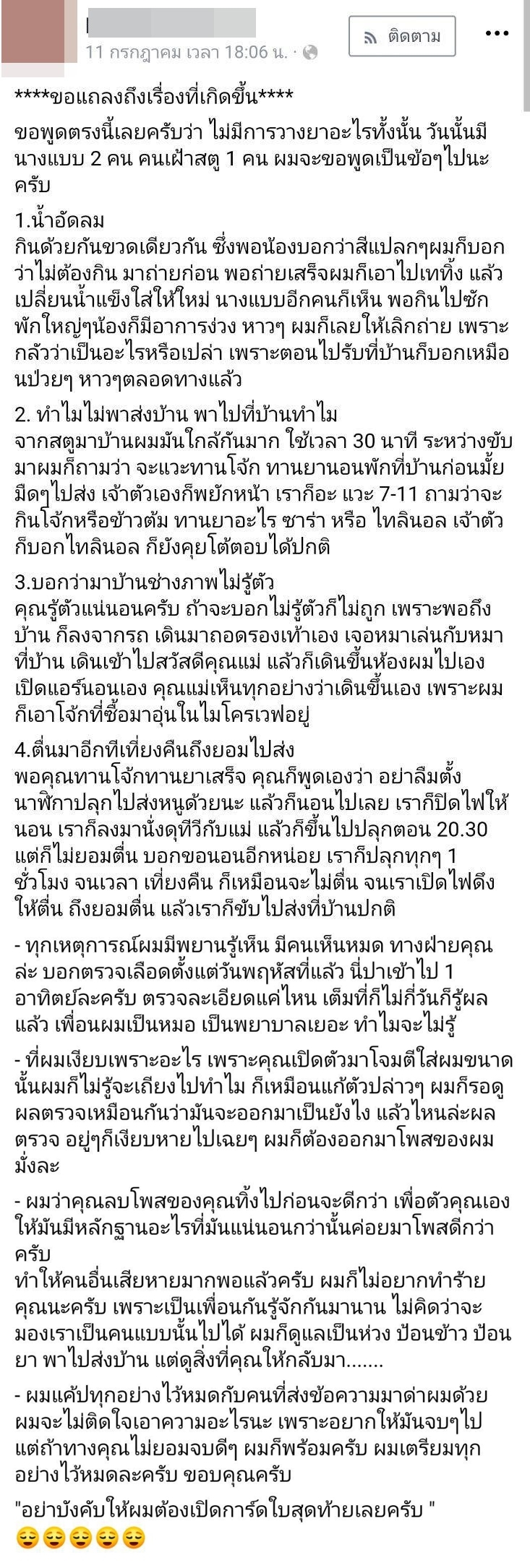 ยืนยันว่าตอนพานางแบบมาบ้าน อีกฝ่ายรู้ตัวแน่นอน พอถึงบ้านก็ลงจากรถ เดินมาถอดรองเท้าเอง เล่นกับหมาที่บ้าน เข้าไปสวัสดีคุณแม่ เดินขึ้นห้องช่างภาพเอง เปิดแอร์นอนเอง ระหว่างที่ตนเอาโจ๊กอุ่นให้ พอทานโจ๊กทานยาเสร็จ นางแบบก็บอกเองว่าอย่าลืมตั้งนาฬิกาปลุกไปส่งหนูด้วยนะ แล้วก็นอนไปเลย ตนก็ปิดไฟให้นอน แล้วมานั่งดูทีวีกับแม่ ปลุกหลายรอบก็ไม่ตื่น จนเที่ยงคืนถึงยอมตื่น จึงขับรถไปส่งที่บ้านปกติ