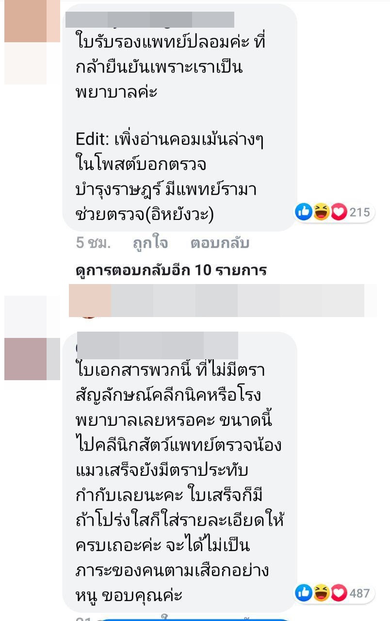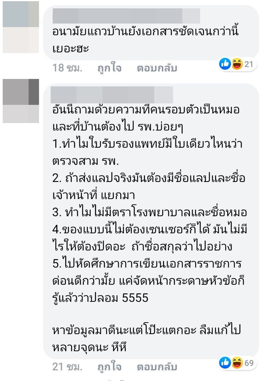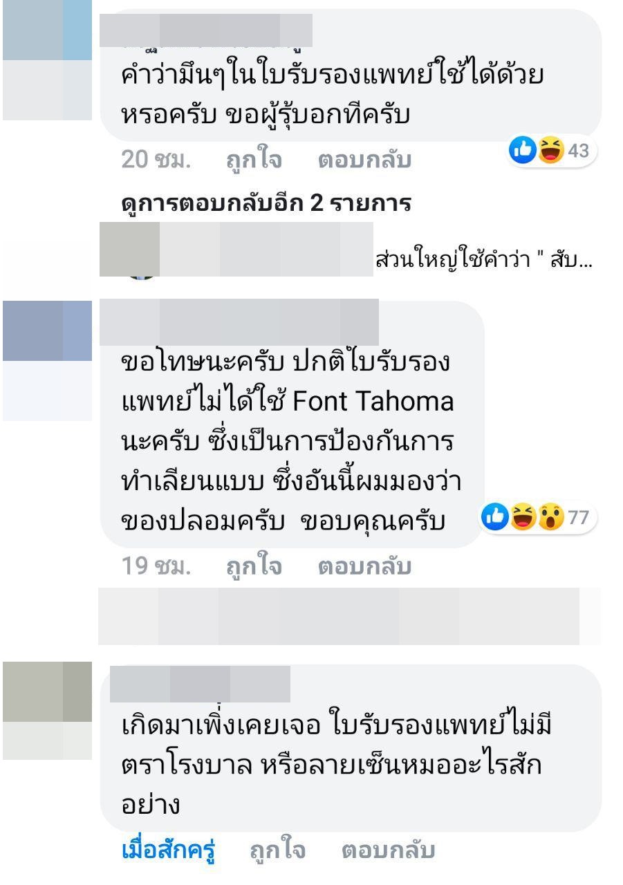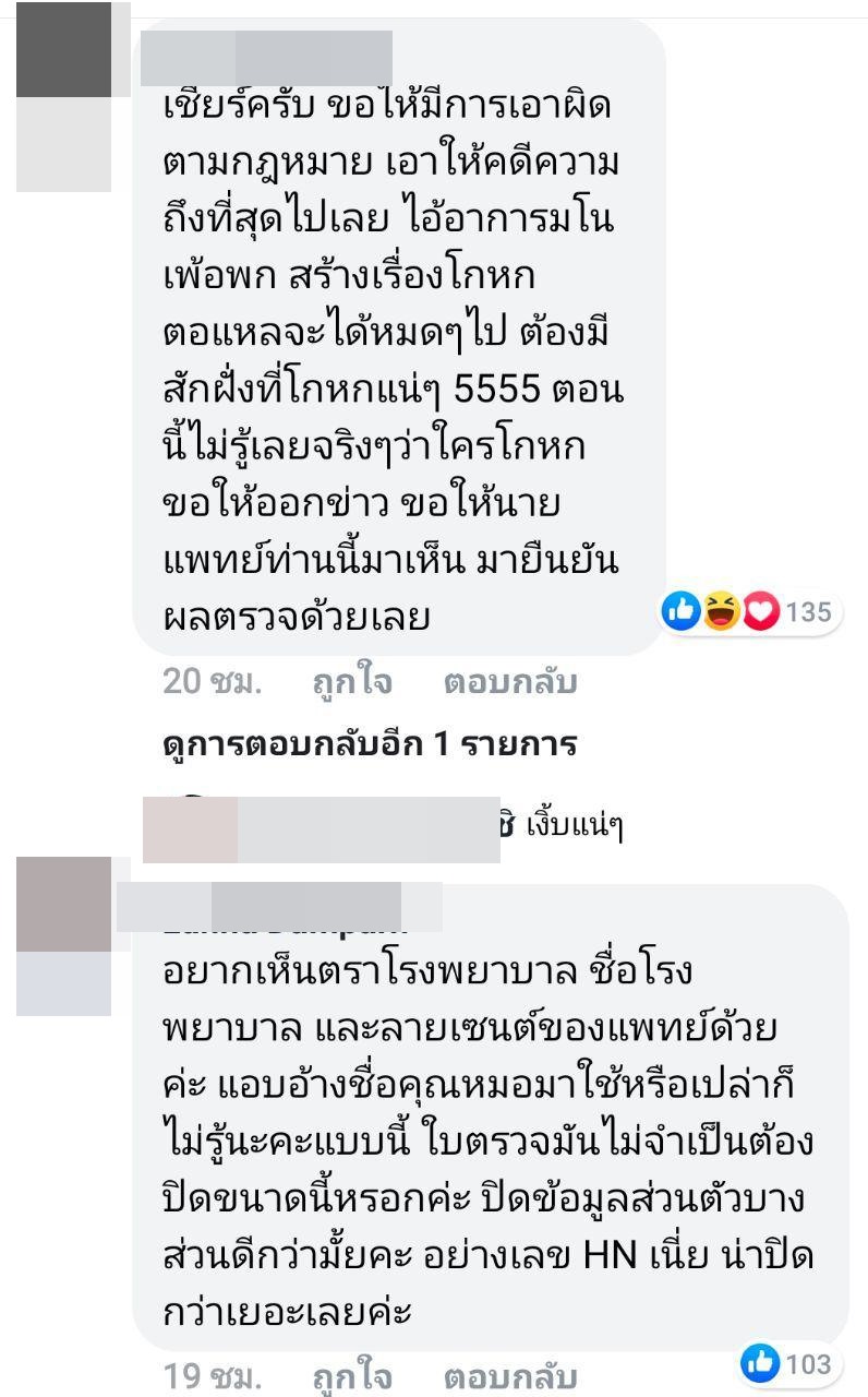 ทั้งนี้ ได้มีชาวโซเชียลที่เห็นโพสต์ดังกล่าว แชร์เรื่องราวกันไปมากมาย บ้างก็เข้ามาคอมเมนต์ ซึ่งหลายคนก็สงสัยว่า ใบรับรองแพทย์ดังกล่าวเป็นของจริงหรือไม่ ดูแล้วไม่ค่อยน่าเชื่อถือ ทำไมผลถึงรอนานขนาดนั้น เจ้าตัวโพสต์บอกว่าเจอเหตุการณ์ตั้งแต่วันที่ 4 กรกฎาคม แต่กลับไปตรวจในวันที่ 7 กรกฎาคม หากจะกล่าวหาคนอื่นพร้อมหลักฐาน ก็น่าจะมีความชัดเจนและน่าเชื่อถือมากกว่านี้หรือเปล่า
