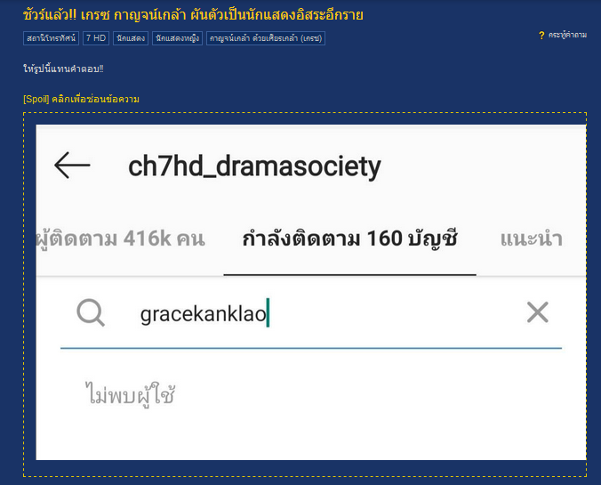 โดยผู้ใช้งานเว็บไซต์พันทิป ได้ออกมาโพสต์กระทู้ "ชัวร์แล้ว !! เกรซ กาญจน์เกล้า ผันตัวเป็นนักแสดงอิสระอีกราย" พร้อมทั้งได้เผยภาพของอินสตาแกรมชื่อ ch7hd_dramasociety ซึ่งเป็นของ ช่อง 7 ว่าได้อันฟอลโลอินสตาแกรมส่วนตัวของ สาวเกรซ ไปแล้ว พร้อมทั้งเปิดเผยว่า ในเว็บไซต์ของ ช่อง 7 ก็ไม่มีชื่อของ สาวเกรซ เป็นนักแสดงในสังกัดแล้วด้วย