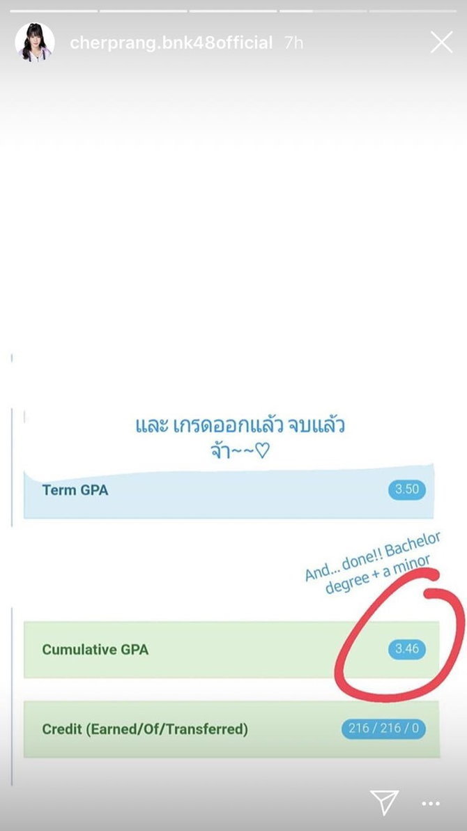 สวยครบเครื่องจริง ๆ สำหรับสาว เฌอปราง กัปตันวง BNK48 เพราะนอกจากผลงานบันเทิงที่โดดเด่นแล้ว เรื่องการศึกษาก็ไม่น้อยหน้า เรียนเก่งสุด ๆ และล่าสุด (1 กันยายน 2562) เหล่าโอตะ ก็ต่างก็แสดงความยินดีกันยกใหญ่ เมื่อ เฌอปราง ประกาศจบปริญญาตรีอย่างเป็นทางการแล้ว เข้าสู่สถานะว่าที่บัณฑิต แถมผลการเรียนยังดีมากอีกด้วย เพราะเมื่อหลายเดือนก่อน เจ้าตัวได้ลงไอจีสตอรี่อวดเกรดกันไปแล้ว ด้วยเกรดเฉลี่ย 3.46 เกียรตินิยมอันดับ 2 ขาดอีกคะแนน 0.04 เท่านั้น ก็จะได้เกียรตินิยมอันดับ 1 แล้ว