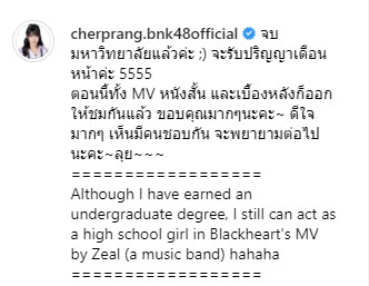 โดย เฌอปราง BNK48 โพสต์ภาพเด็กแว่นในชุดนักศึกษาบอกว่า "จบมหาวิทยาลัยแล้วค่ะ จะรับปริญญาเดือนหน้าค่ะ 5555 ตอนนี้ทั้ง MV หนังสั้น และเบื้องหลังก็ออกให้ชมกันแล้ว ขอบคุณมาก ๆ นะคะ ดีใจมาก ๆ เห็นมีคนชอบกัน จะพยายามต่อไปนะคะ ลุย"