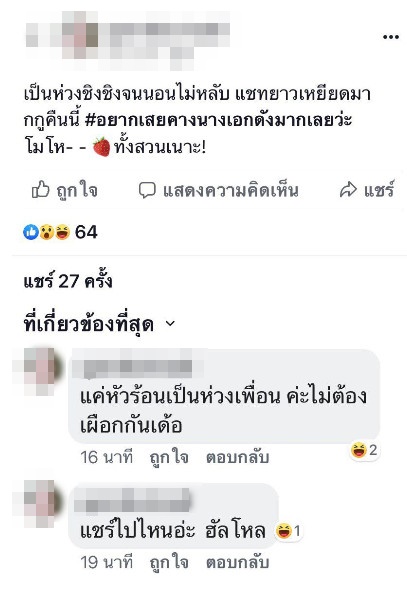 นอกจากนี้ เพื่อนคนเดิมยังโพสต์ข้อความแรงอีกว่า "เป็นห่วงชิงชิงจนนอนไม่หลับ แชตยาวเหยียดมากกูคืนนี้ #อยากเสยคางนางเอกดังมากเลยว่ะ โมโห (อิโมจิสตรอว์เบอรี่) ทั้งสวนเนาะ"