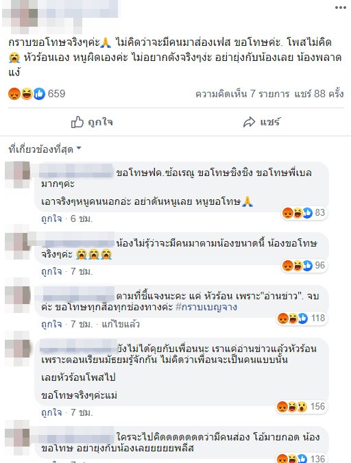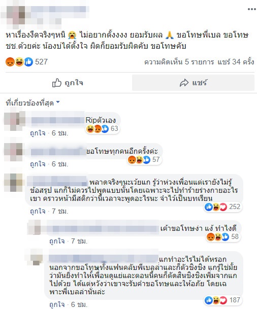 โพสต์แรงถึงขั้นจะทำร้ายร่างกายแบบนี้ ทำเอาเจ้าตัวโดนชาวเน็ตรุมถล่มหนัก จนต้องลบโพสต์ทิ้งไป พร้อมโพสต์ข้อความขอโทษทุกคน ทั้งเบลล่าและชิงชิงด้วย บอกตนไม่ได้ตั้งใจ แค่อ่านข่าวแล้วหัวร้อนเฉย ๆ ไม่คิดว่าจะมีคนมาส่องเฟซบุ๊ก ตนผิดก็ยอมรับผิดที่หัวร้อน ยอมรับว่าตอนนี้ยังไม่ได้คุยกับชิงชิงเลย แต่ตนไม่คิดว่าเพื่อนจะเป็นคนแบบนั้นเลยโพสต์ไป ขอร้องทุกคนอย่ายุ่งกับตนเลย ตนไม่ได้อยากดัง