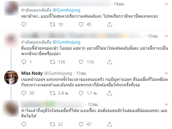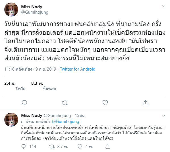 โดยคุณแม่ระบุว่า พฤติกรรมดังกล่าวเปรียบเหมือนการโกงประเภทหนึ่ง และทำให้นึกย้อนไปว่า จริง ๆ แล้วเคยโดนแบบไม่รู้ตัวมาแล้วกี่ครั้ง ? ซึ่งถ้าพนักงานไม่มาถาม ก็คงมีคนหัวเราะชอบใจว่าได้กินฟรีอีกแล้ว โกงน้องสำเร็จอีกแล้ว ซึ่งคุณแม่จำได้ว่าพวกเขาคือใคร แต่ขออโหสิกรรมให้ นอกจากนี้ คุณแม่ยังบอกว่า เจอหน้าแฟนคลับกลุ่มนี้แทบทุกครั้งในเวลาของครอบครัว ก่อปัญหาอยู่บ่อย ๆ มีรอยยิ้มที่ไม่เหมือนกันระหว่างเจอหน้าและลับหลัง แต่พวกเราก็ยังต้องยิ้มให้พวกเขาทุกครั้งที่เจอ