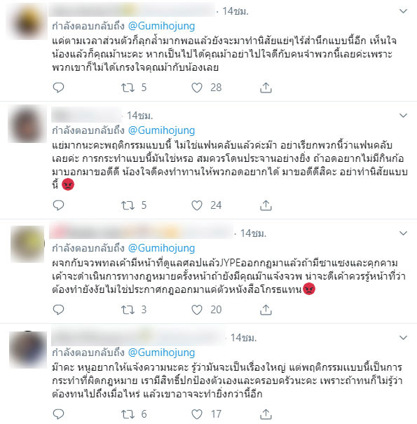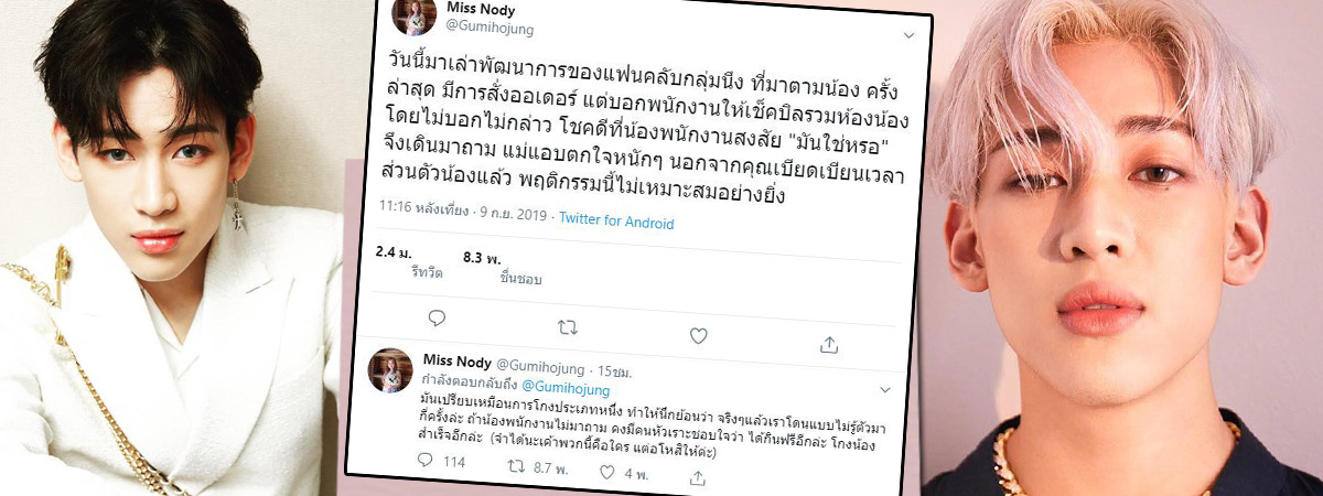 ล่าสุด (9 กันยายน 2562) แม่จุ๋ม คุณแม่ของแบมแบม ได้ทวีตข้อความลงในทวิตเตอร์ส่วนตัว @Gumihojung เปิดเผยถึงพฤติกรรมของแฟนคลับกลุ่มหนึ่งที่ตามแบมแบมไปถึงโรงแรม แถมยังมีการสั่งอาหารมากิน แล้วแจ้งให้พนักงานลงบิลเดียวกับแบมแบมอีกด้วย โดยไม่มีการบอกกล่าวกันก่อน โชคดีที่พนักงานเกิดสงสัยว่ามันใช่เหรอ ? จึงมาถาม ทำให้คุณแม่ตกใจมาก เพราะนอกจากกลุ่มแฟนคลับเหล่านี้จะเบียดเบียนเวลาส่วนตัวของแบมแบมแล้ว ยังมีพฤติกรรมไม่เหมาะสมอย่างยิ่ง