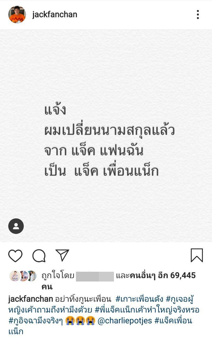 ล่าสุด (9 กันยายน 2562) แจ็ค แฟนฉัน ก็เรียกเสียงฮาอีกครั้ง หลังโพสต์ประกาศผ่าน IG ว่า "แจ้ง ผมเปลี่ยนนามสกุลแล้ว จาก แจ็ค แฟนฉัน เป็น แจ็ค เพื่อนแน็ก" พร้อมแคปชั่น "อย่าทิ้งกูนะเพื่อน #เกาะเพื่อนดัง #กูเจอผู้หญิงเค้าถามถึงหำมึงด้วย #พี่แจ็คแน็กเค้าหำใหญ่จริงหรอ #กูอิจฉามึงจริงๆ @charliepotjes #แจ็คเพื่อนแน็ก"