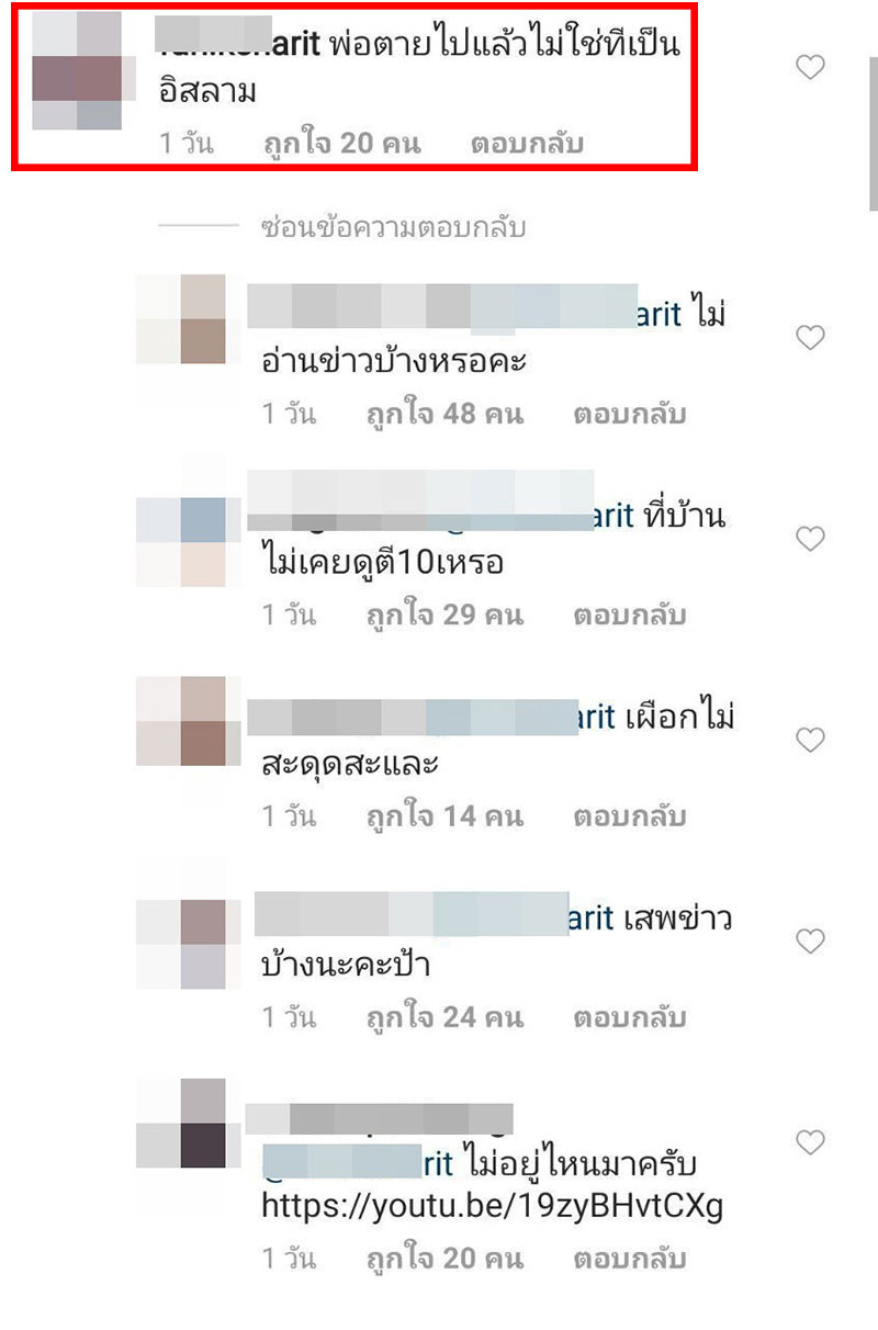 แต่งานนี้ก็ไม่วายมีดราม่า เพราะมีคนเข้ามาคอมเมนต์แรงว่า "พ่อตายไปแล้วไม่ใช่ที่เป็นอิสลาม" จนมีแฟน ๆ ที่เห็นคอมเมนต์ดังกล่าวแล้วไม่โอเค เข้ามาตอบโต้กันเพียบ โดยมองว่าเป็นคอมเมนต์ที่ใช้คำแรงเกินไป ไม่ให้เกียรติกัน บ้างก็บอกให้เจ้าของคอมเมนต์ติดตามข่าวบ้าง คนที่เสียชีวิตคือคุณปู่ของแพท ไม่ใช่คุณพ่อ
