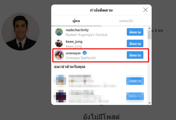 และพอเล่นไอจีปุ๊บ โดยที่ยังไม่โพสต์อะไร หนุ่มณเดชน์ก็จัดการฟอลโลสาวคนสนิทอย่าง ญาญ่า อุรัสยา ปั๊บ เป็นคนแรก แต่ไม่นาน ณเดชน์ก็ตามมาฟอลโลแม่แก้ว และกลุ่มแฟนคลับของตัวเอง โดยที่มีการฟอลโลทั้งหมด 3 คน