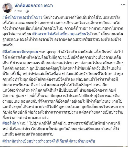 เกี่ยวกับเรื่องนี้ วันที่ 26 กันยายน 2562 คุณพ่อของ เหม ได้โพสต์ผ่านเฟซบุ๊ก นักคิดนอกกะลา เดชา ระบุว่า ขอบคุณทุกกำลังใจ การเดินหน้าต่อไปโดยไม่มีลูกชายเป็นอัศวินคู่กายนั้น ช่างเดียวดายเหลือเกิน ที่ผ่านมาต่างคนต่างต่อยอดให้กันและกัน ที่ผ่านมาลูกเป็นคนกตัญญู ยอมรับว่าครั้งนี้พ่อแม่เสียใจที่สุดที่ลูกตัดสินใจแบบนี้ เพราะความผิดหวังจากคนไม่รักษาคำพูด